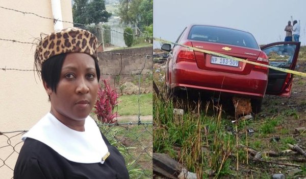 When the first witnesses arrived on the scene Nokuthula Magwanyana's body was still in the drivers seat with the drivers side door open, she was being held in only by her seat belt. She had numerous wounds to her body which indicated that she was hacked and stabbed to death either by a small panga or a large knife.